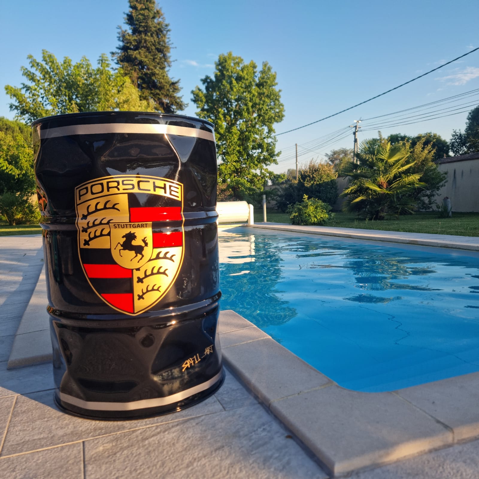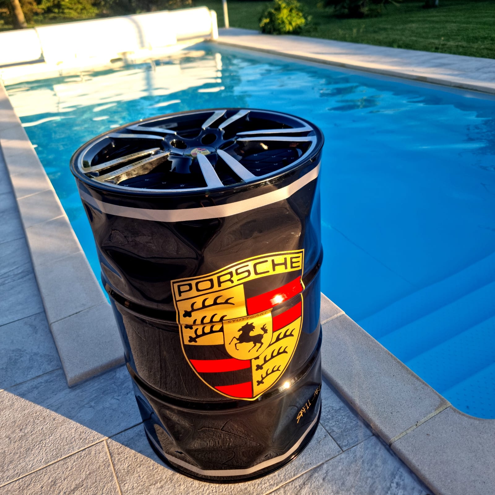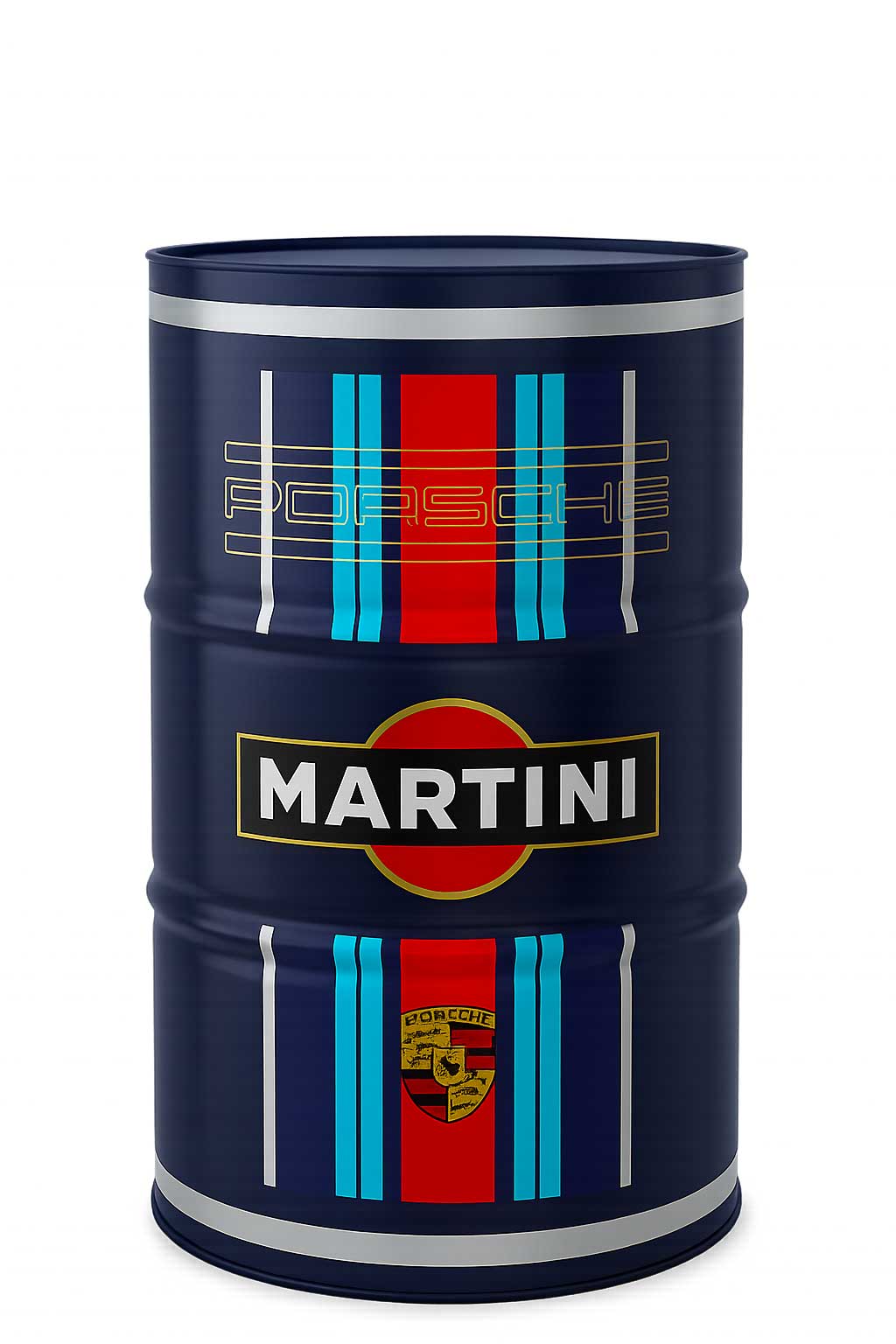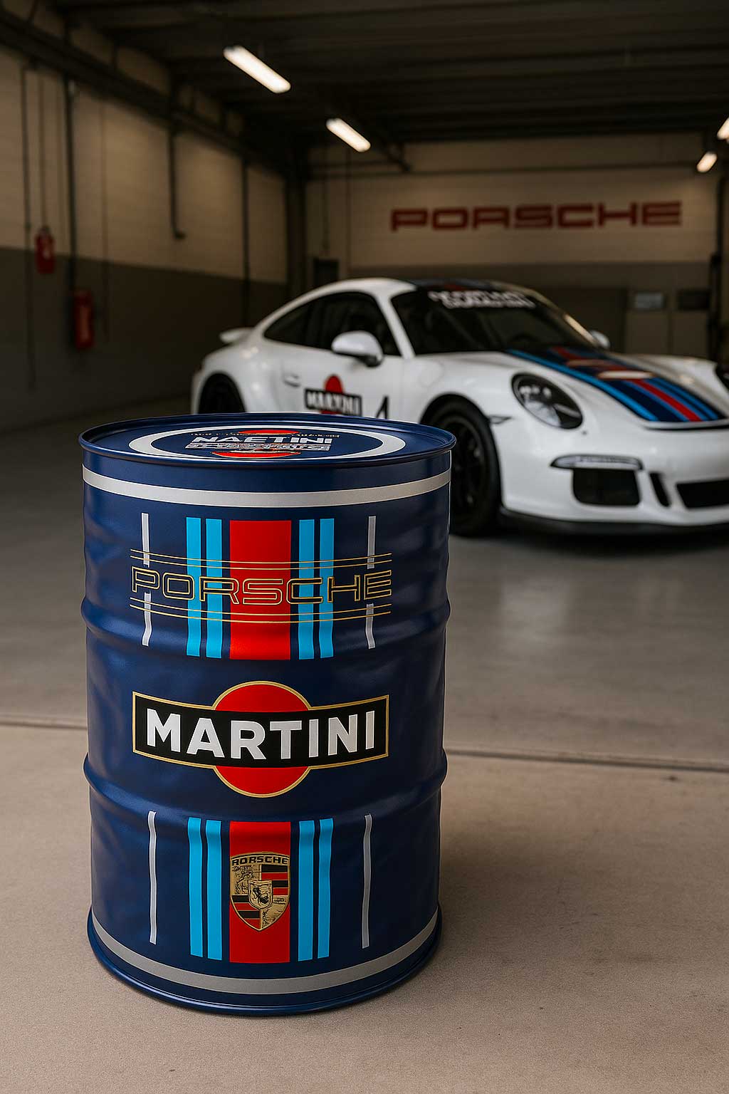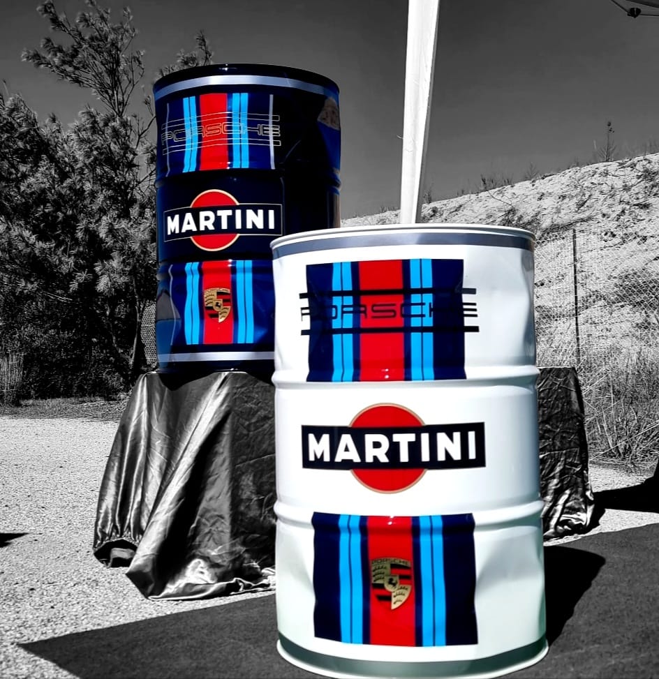 Baril déco à l'effigie de PORSCHE MARTINI CUP , réalisation toute en peinture finition Noire ,
